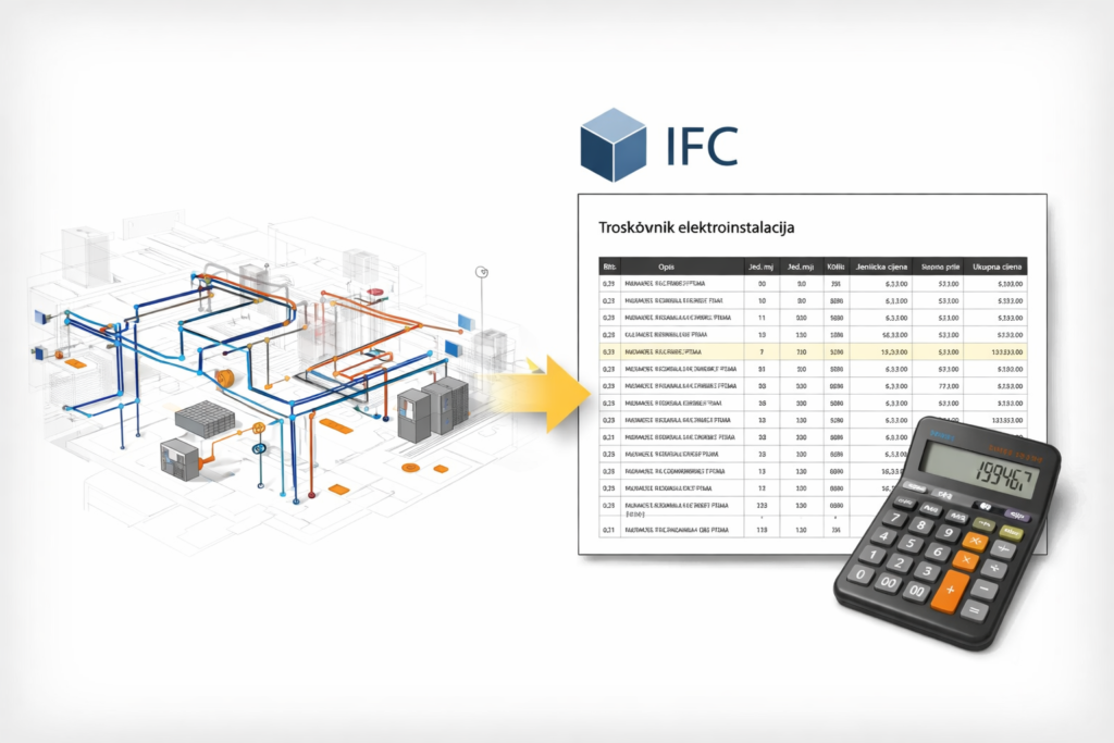 Troškovnik elektroinstalacija izrađuje se na temelju IFC BIM modela te obuhvaća izdvajanje količina materijala, opreme i instalacijskih elemenata. Takav pristup omogućuje točniji uvid u opseg radova i kvalitetniju pripremu ponuda.
